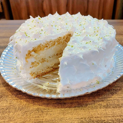 Massa branca, recheio de mousse de limão com cobertura de marshmallow e raspas de limão. |